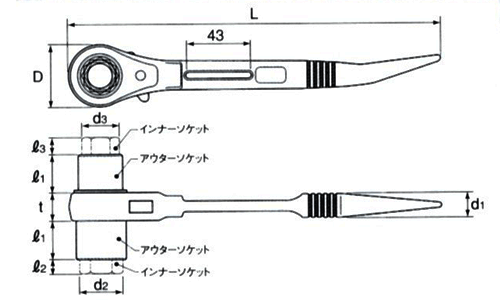.With a sliding hole in the body for safety rope. .With pitches on the grip for non-slip. APPLICATIONS: .For professionals works such as .Electric equipment and factility works. .Construction (Scaffolding) works. .Housing works. .Other engineering works. MECANISM OF THIS WRENCH .When using the outer socket, the inner socket, which is in the outer socket, is pushed up with a light force. After finished the operation, the inner socket is returned to the original position because of the spring.