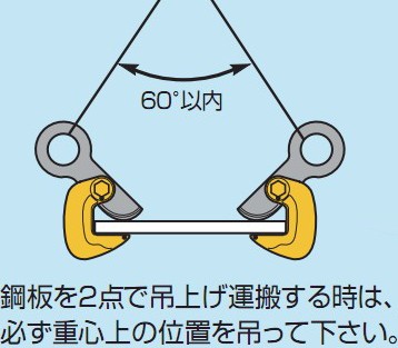 Clamp for lateral (horizontal) lifting and handing of rigid steel plates, "H" and "l" beams. ■FEATURES ●The spring-loaded tightening lock mechanism assures a positive initial clamping force. ●The clamping force increases in proportion with the weight of the load. ●The main body and the shackle are made of die-forged special alloy steels, which are optimally tempered for maximum strength and durability. ●High-frequency quenching of die-forged special alloy steels gives greater durability to the cam. ●The main body is a baked-on finish. ●The clamp body can be easily checked for deformationby measuring the safety points.